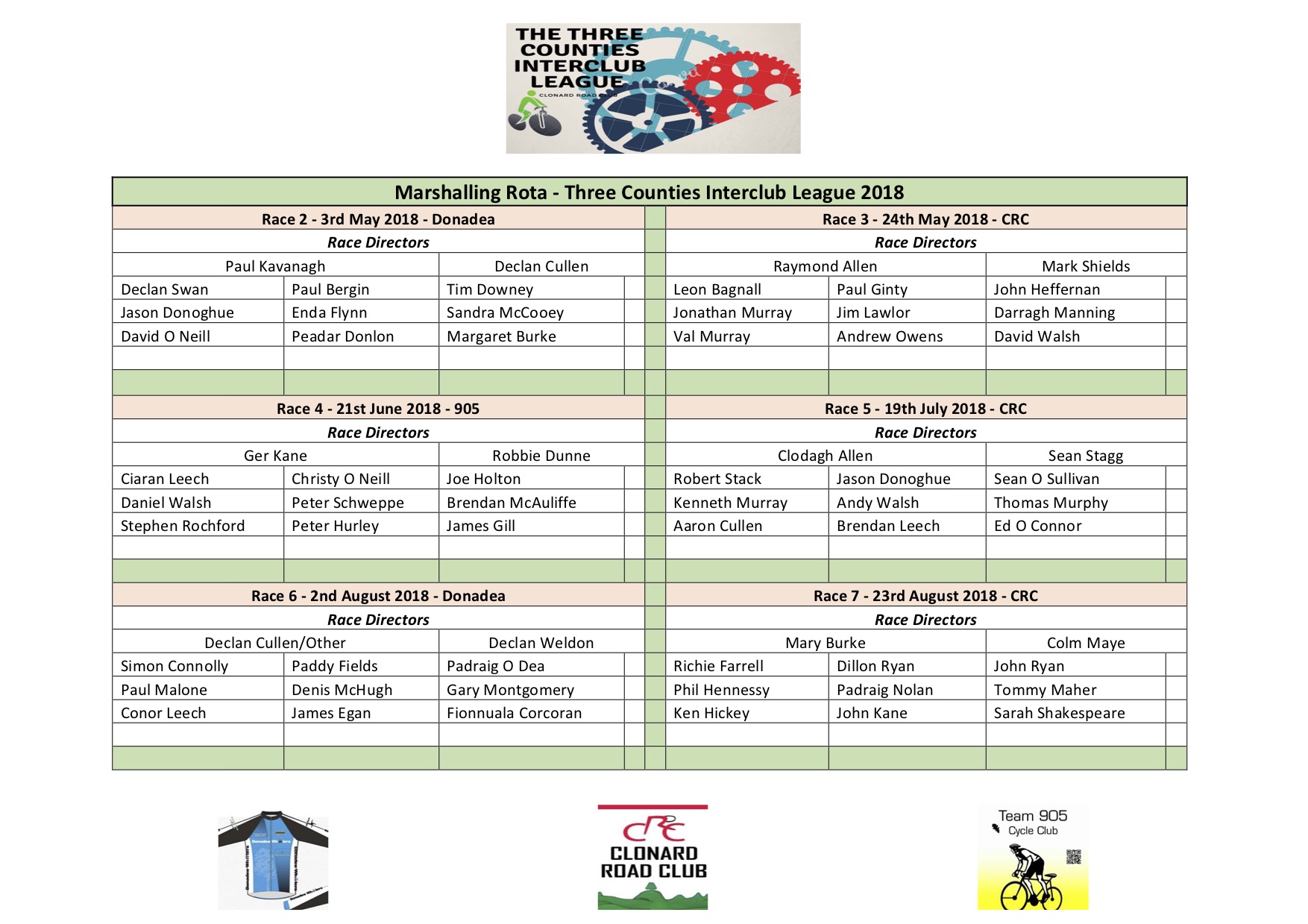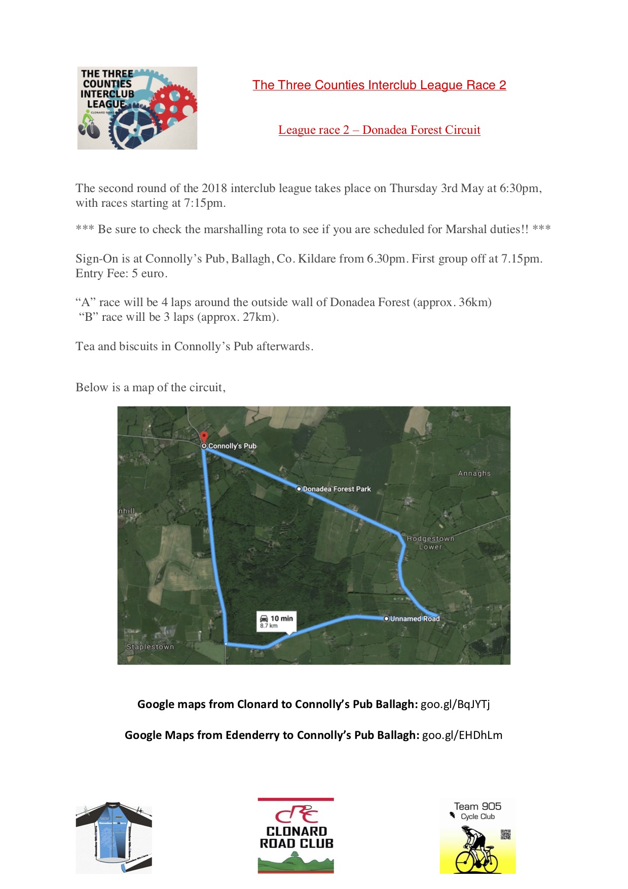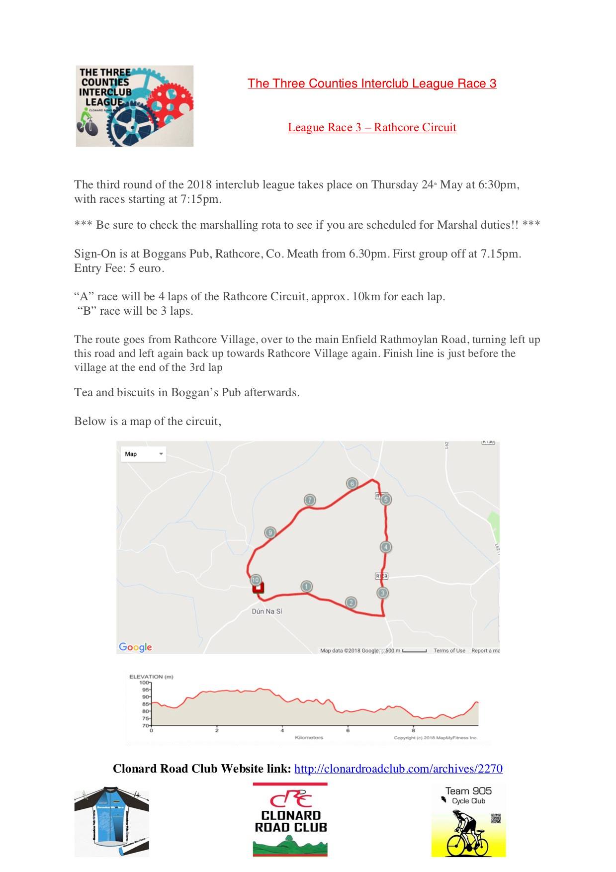 The Three Counties Interclub League Race 3 ———————————————- **Rathcore Circuit – Please find attached more information on handicaps for the night** Please note all riders must have a Cycling Ireland LC licence to race, (e.g. 18LC00100) if in doubt please contact info@clonardroadclub.com Race Directors: Mark Shields and Sean Stagg